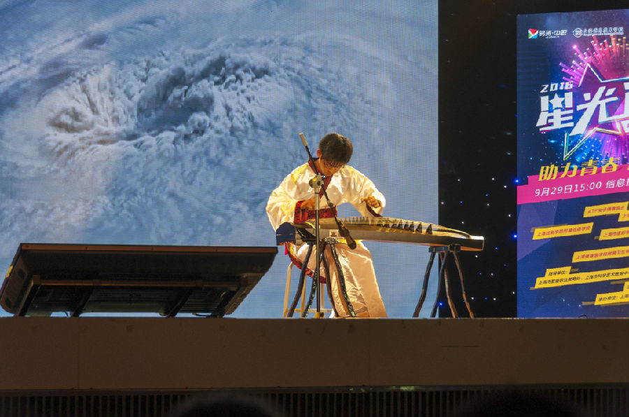 合唱之后上海市医药学校的一曲古筝独奏《战台风》弹出了一个民族坚强不屈的精神。