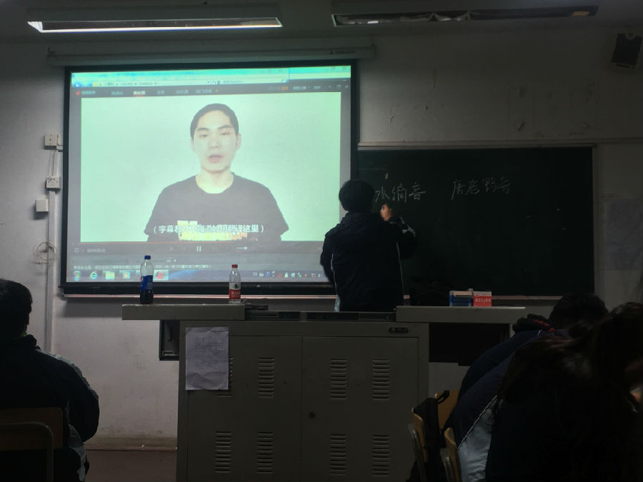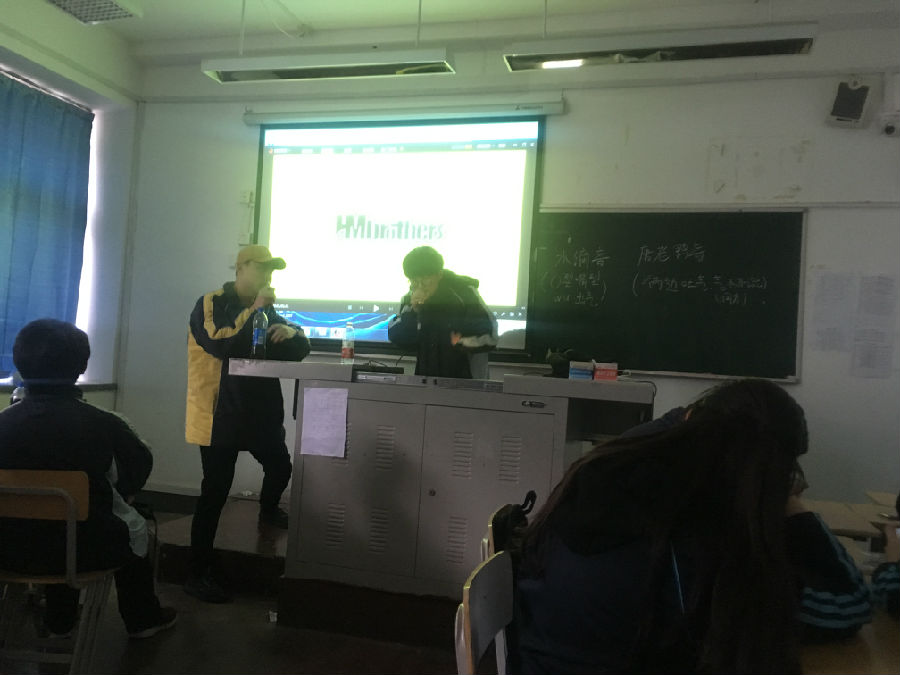 社长先给我们播放了一些B-Box的教学视频,分别是水滴音和唐老鸭音,都是极考验练习者功力的技巧。在看完视频讲解后,又在黑板上为我们细心分析,还用两个技巧各给我们进行即兴表演,让台下的人忍不住发出阵阵惊叹声,教室里顿时响起了热烈的掌声。之后社长还为我们展示了一些B-Box基础的大鼓小鼓的即兴表演,让小编在整节课中都沉浸B-Box欢快,激昂的旋律中,同时也对B-Box有了更多的认识。