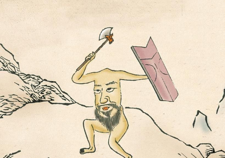 巨人一摸颈上没了头颅,心中慌张,急忙放下斧盾,弯腰伸手,往地上乱摸。那高挺的大树,突兀的岩石,在那双巨手的触摸下折断了,崩裂了,直弄得尘土纷扬,木石横飞。黄帝怕巨人摸着了头颅接上,赶紧手起剑落,将常羊山一劈为二,那头颅骨碌碌滚入山內,大山又合而为一。