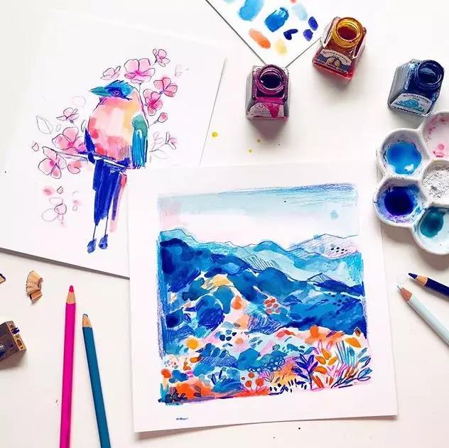 彩墨插画,不同的画材叠加使用呈现出丰富多彩的变化,让作品的变现力更强。