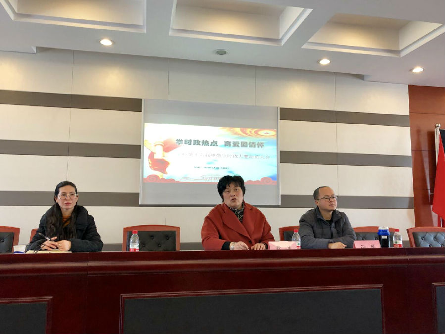 我校于2019年3月8日在教学楼四楼阶梯教室举行上海市第16届时政大赛校内动员会,为了激励入围时政大赛复赛的15位同学,继续努力为校争光。参加此次会议的有德育教研室全体老师及参赛队员、各班班长,团支书、副校长翁洁翁校长、学生科科长孙腾老师、时政大赛负责老师龙碧慧老师、德育教研室全体老师。