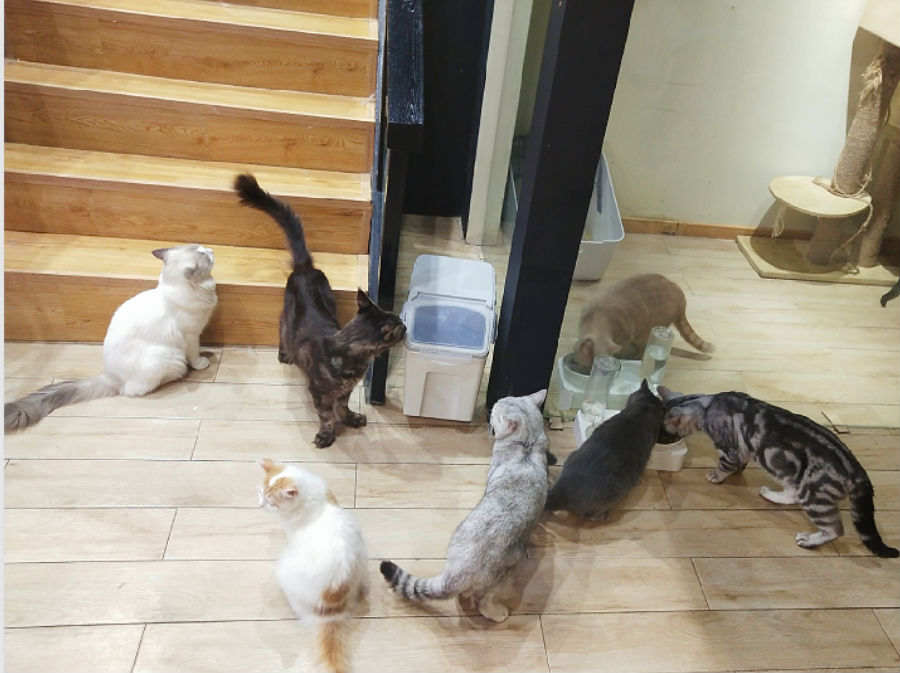 推开店门,便看到一只毛色如雪般的布偶站在柜台上,双眼如同名贵的蓝宝石般清澈闪亮。店员小姐非常热情,双手消毒完毕后便可以开始尽情“撸猫”了。
