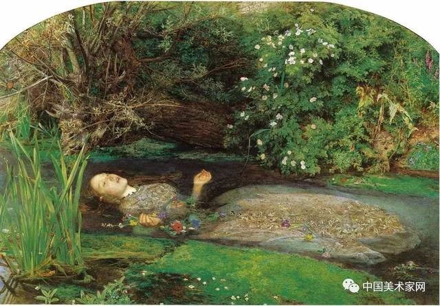 而此时的1852年,摄影作为工具,刚刚开始冲击英国的绘画市场,在这样的历史背景下,这幅画里那些图形的意义也更加重要了,比如她手中的花环,里面有代表抛弃的杨柳枝,有代表童真的毛茛,有代表后悔的荨麻,也有代表死亡的罂粟。