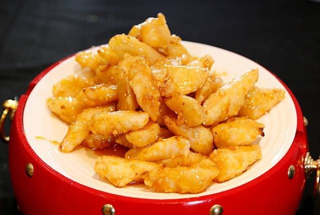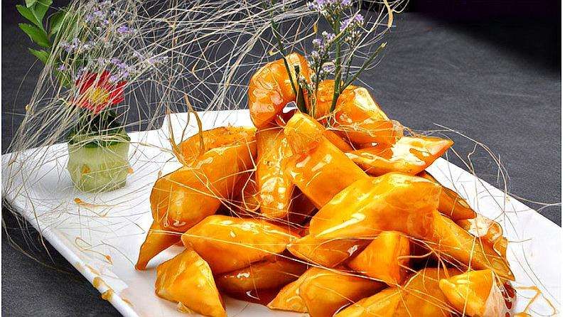 拔丝山药,传统名点,年节食品,是过年迎春菜式中的一道甜点,又甜又黏,甜脆香酥,软糯香甜。山药原名薯蓣,唐代宗名李预,因避讳改为薯药;北宋时又因避宋英宗赵曙讳而更名山药。“拔丝山药”为素馔名品,颜色柿黄,能拔出长丝一丈,脆甜爽口,为压桌甜菜。到鲁菜馆吃饭,除了吃九转大肠、糖醋鲫鱼等主菜外,最后的甜品往往是拔丝菜肴。济南拔丝菜肴是山东十大名吃之一。