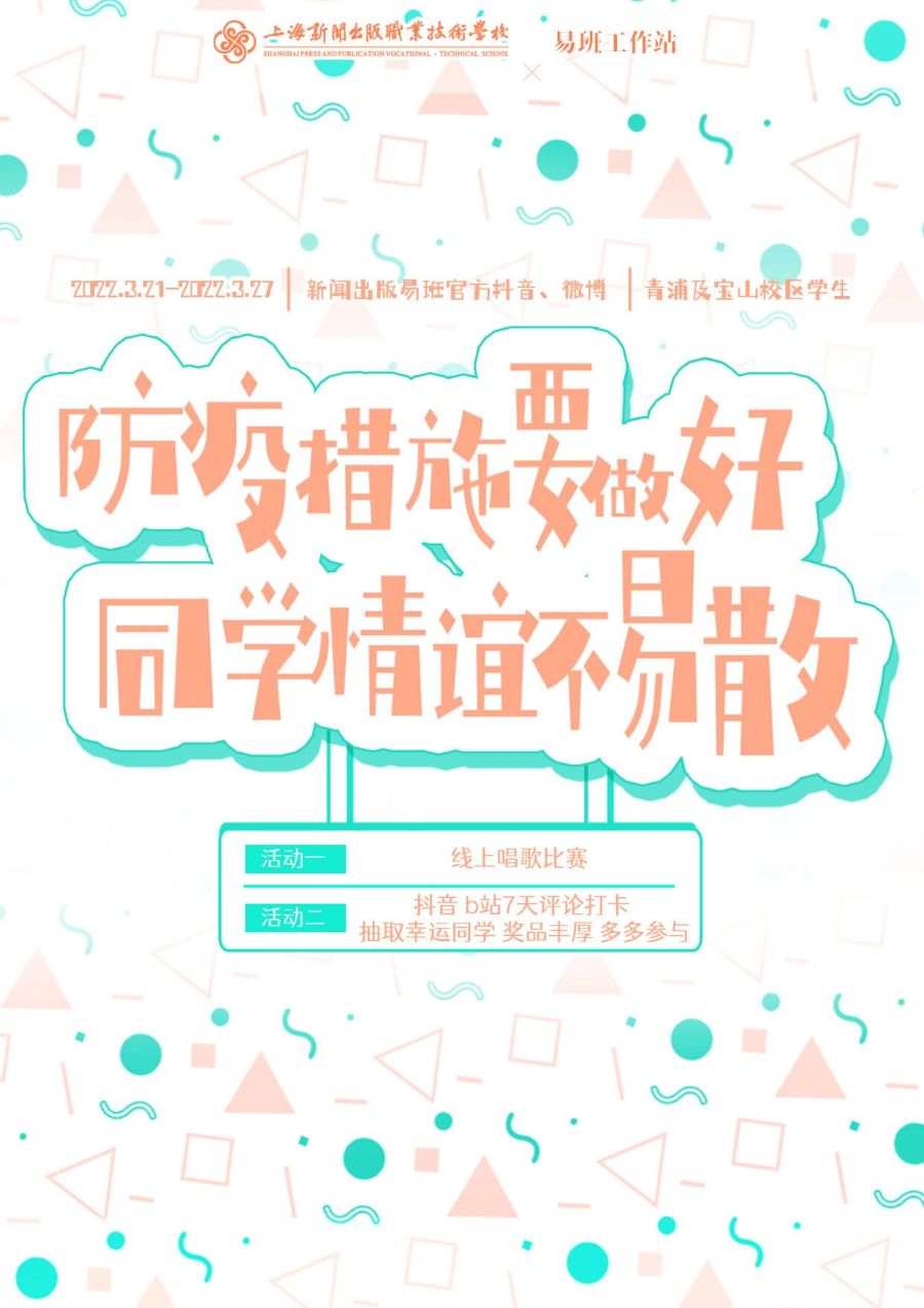 本次“防范措施要做好 同学情谊不易散”线上活动已圆满结束,“易起来留言”和“易起唱唱唱”带领同学们在文字与音乐的海洋中遨游,也感受到了我校学子的魅力与风采。“青春才几年,疫情占三年”,我们的青春不只有口罩、核酸、疫苗、线上学习,更有责任、坚守、热爱、希望。殷忧启圣,多难兴邦。共同战“疫”,我们“同袍”共情、偕作、偕行,我们同努力,疫情定可防。终有一天,我们会摘下“口罩”,去到我们想去的地方,去完成青春年少的梦想。相信上海清零解封的那一天会早日到来,风雨过后是彩虹!众志成城共抗“疫”,我们“易”起在行动。