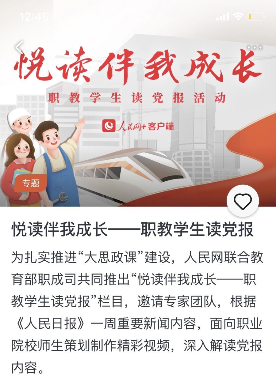 该活动旨在为职业院校开展思政教育提供优质学习资源,引导广大职教学生热爱阅读、坚定信念、德技并修。作为新时代青年,这些线上思政课平台,使之意识到自己身上肩负的时代责任与国家赋予的使命。深深感受到了党和国家对于青年的嘱托和希望。读党报会发现别人没发现的东西。要带着问号去读党报,发现背后的撰文逻辑,如会议名称的写法、会议召开的时间顺序、机构的性质、领导的排名等等。不要把自己当作评论员,而要当作交易员,把在党报中发现的东西,指引自己的生活和发展。认真学习、阅读党报、党刊,分享感悟和成长,这些所见、所闻、所感激励我们珍惜青春时光、坚定理想信念,奋发有为的推动新时代发展,努力向党和人民交出满意的答卷。