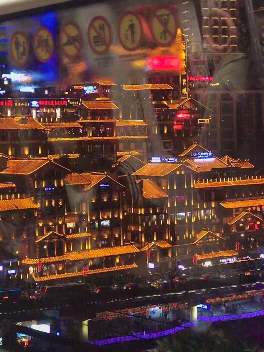 等到太阳落山,黑夜冲淡了山城的燥热,闪烁的灯光为城市披上了另一种繁华。宏伟的千厮门长江大桥连接着江两岸的霓虹,江面上行驶着数不清的游船,它们个个闪烁着五彩的灯光。桥的南边就是著名的洪崖洞夜景,还有吊脚楼和仿古商业街,它们被金黄色的灯带衬托着,显得大气、繁荣。立在天台上,望见江面上船帆林立重庆就是这样特殊地存在,城市空间仿佛在这里扭曲了似的,有长达112 米的扶梯,也有穿楼房而过的轻轨,它的繁华引人入胜,却也能回归朴实的生活。