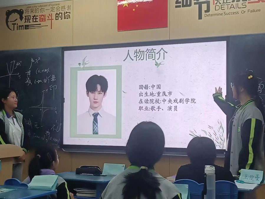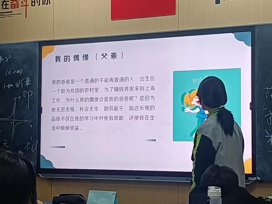 张诗佳的偶像是EXO,他们在舞台上闪耀的样子是她前进的动力;朱炜辰的偶像是周杰伦,在这样一个充满着各种外国音乐的时代里,周杰伦依然在华流这片领域大放异彩;马浩芸的偶像是张真源,虽然他是一个胡咖,但他的实力仍为他吸引力许多年粉丝,并且为他遇到困难不退缩的努力而感到骄傲。我的偶像是邱芜,在一个充斥着阴暗气息的家里,她却仍为他人的安全而努力着。赵宁静的偶像是她的爸爸,她是一个十分懂得感恩的小女孩,从不会把他人对她的付出当作是自己应得,她也因为自己着一颗充满着感恩与爱的心,在专业课上大放异彩。