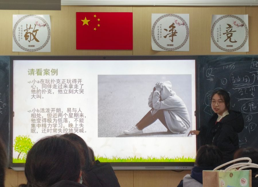 在班会课上,我们的心理委员组织进行了一场关于心理教育的主题班会,同学们都非常积极的参与其中,进行小组讨论,回答问题等。学习到了很多心理相关的问题,也抒发了自己心中的压力