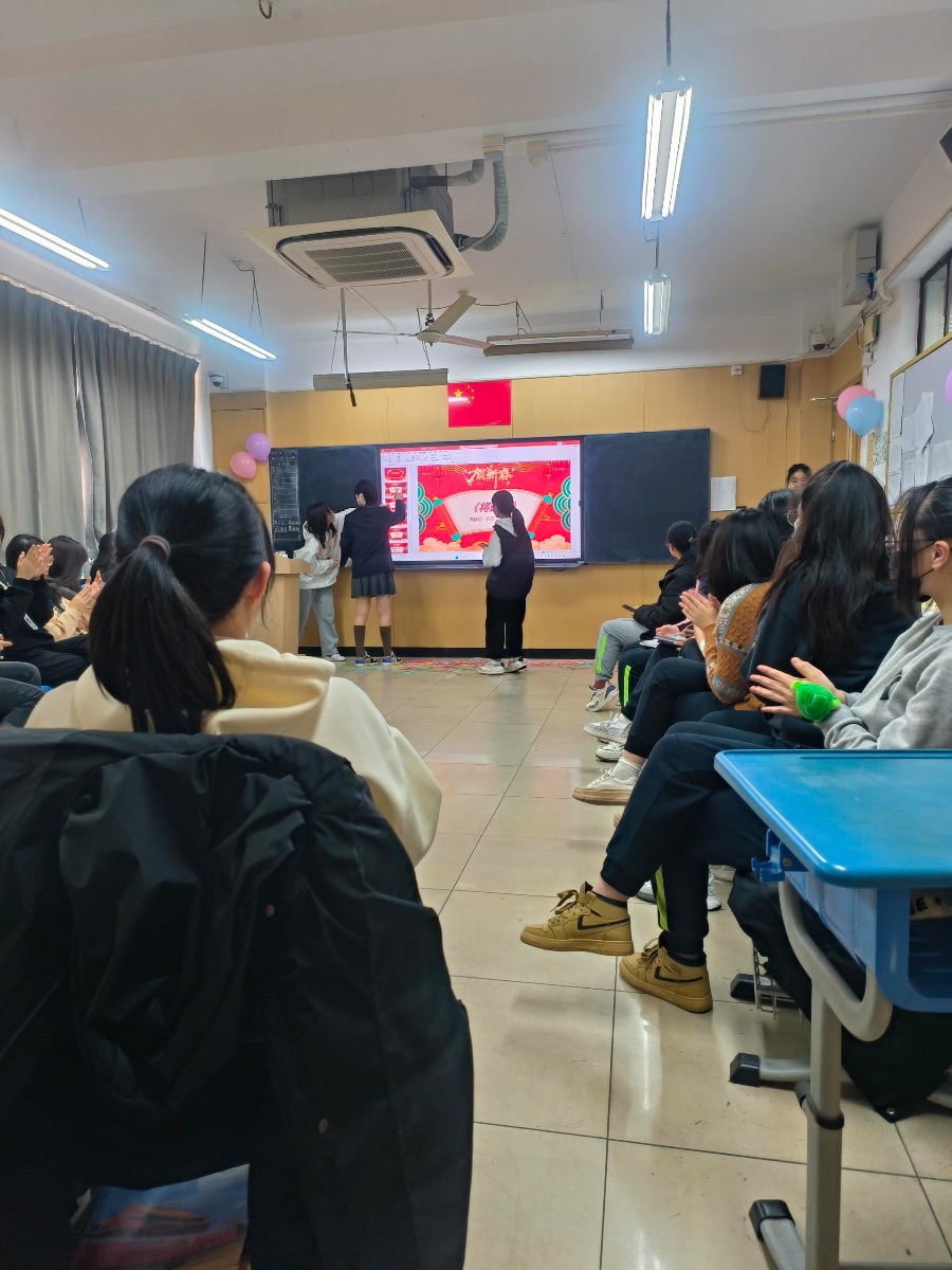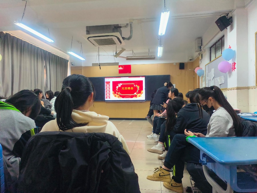 晚会的开始主持人富有感染力的的开场白让气氛高涨起来,第一个表演有三位同学朗诵了李白的《将进酒》语气中都流露着李白的豪迈,此后两位女同学也表演了甜美舞蹈。设置的游戏环节也是乐趣多多,抢椅子、听歌识曲,大家都积极参加,为了小礼物去争夺胜利。班里一部分同学编制了小型情景剧,祝贺大家迎接新的一年,在新年里也开开心心的。唱歌也是必不可少的表演,两位同学相继带来歌曲和串烧,让同学们享受其中,来一次听觉盛宴。晚会的最后主持人也预祝大家新的一年里能心想事成,所愿皆成真!