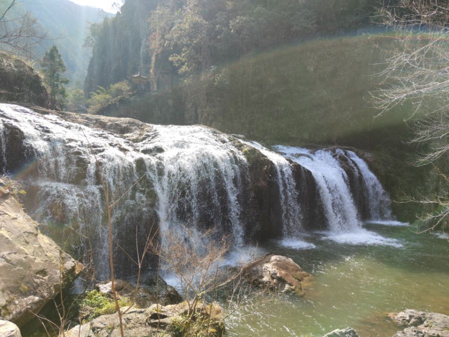 阳光穿透林间,在瀑布上晕出淡淡的彩虹,为这幅山水图增添了一抹梦幻色彩。山间空气清新,负氧离子满满,深吸一口,满是草木与水汽的清香。在这里,远离城市的喧嚣,只余山水的宁静与壮阔,让人沉醉在自然的怀抱里,身心都得到彻底的放松。