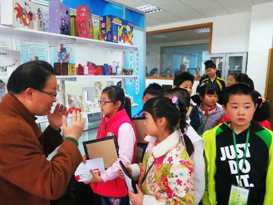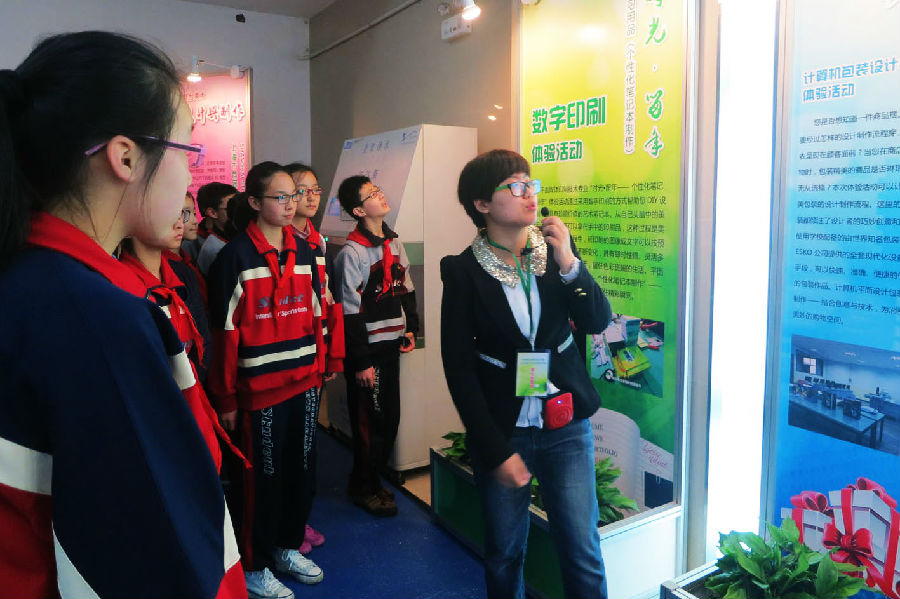 围绕“走进一所学校,体验一个项目,了解一门职业,感受一种文化”的宗旨,我校的职业体验活动主要集中于五个项目,分别是时光留年——个性化笔记本制作、精美包装物展示、展台美术设计与制作、出版物推荐与传播,学生社团活动作品展。在学校老师和学生志愿者的共同努力下,参与体验的五大项目分别展现了各自独特的魅力,吸引中小学生、家长和老师的驻足流连。人气最高的职业体验项目是位于二楼的个性化笔记本制作和精美包装物展示。自己穿针引线来装订线装笔记本、把自己的照片加工制作成笔记本的封面、操作机器切割、制作包装盒等体验项目赚足眼球。最有视觉享受的是位于一楼展厅的展台美术设计与制作,两张大大的展示台上摆满了五颜六色的马克笔和彩铅,每位体验者都可以根据自己的审美判断来填涂由我校学生绘制的铅笔图画。无论是中学生还是小学生都非常喜欢这个体验项目,因为这既是一个了解美术设计基本功的过程,也是一个培养审美感受的过程。最有创意的体验项目是三楼出版物推荐与传播,充分利用了数字媒体手段,让学生感受和体验信息技术条件下数字出版物的无穷魅力。学生社团活动作品展应该是布展中最闪亮的部分,这里有巧手社和粉雕社老师和学生共同制作的手工艺品,十字绣、绢花、立体纸艺、钻石绣、粉雕等,从一个侧面传递着丰富多彩的校园文化气息。